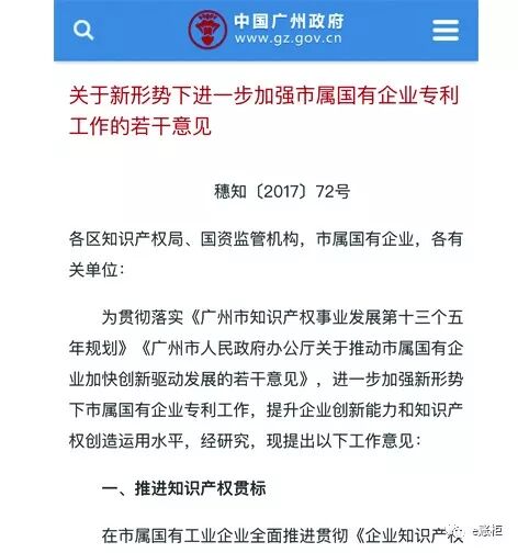 今年广州市政府发布红头文件!文件中明确提及:在市属国有企业工业企业全面贯彻《企业知识产权管理规范》国家标准,以企业集团为单位,明确贯标时间表,开展贯标管理宣传辅导。至2018年末,市属国有企业中高新技术企业要全部通过贯标认证;2020年末,市属国有工业企业全部通过贯标认证。符合条件的贯标认证企业仍然可享受政府资助。