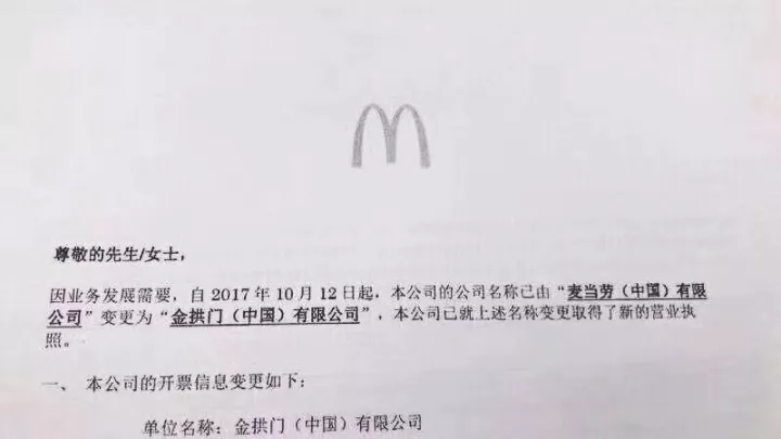 据国家企业信用信息公示系统消息,麦当劳(中国)有限公司已正式更名为金拱门(中国)有限公司。